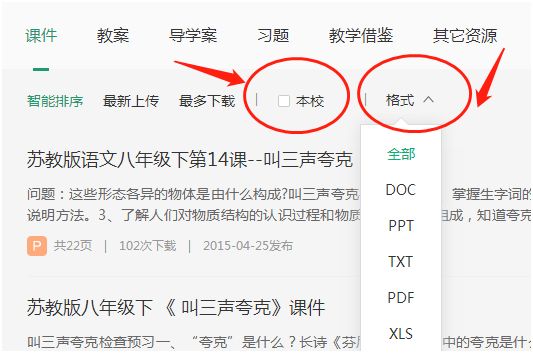 答:教師可以隨意修改自己所需資源格式,本校資源也提供了勾選標簽,在老師們使用一段時間積累至少一篇素材后,本校資源才會展示喲