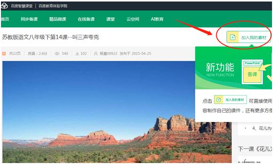 1)在同步備課中找到自己所需資源,進入后點擊“加入我的素材”按鈕