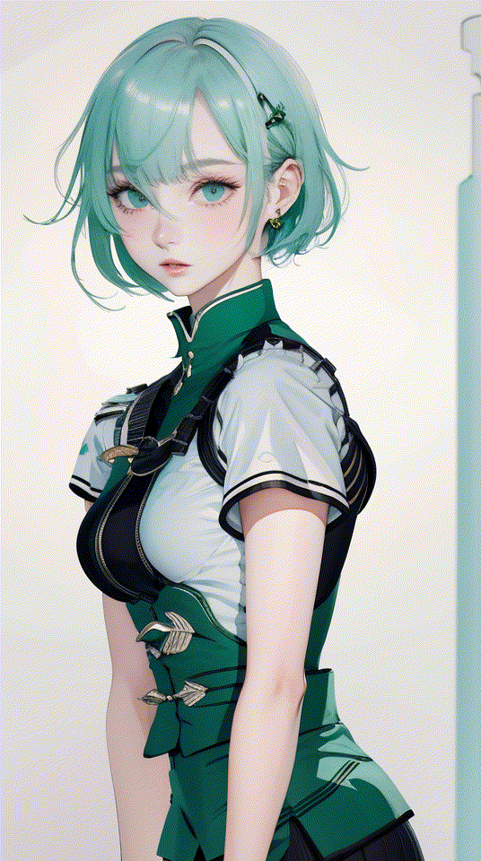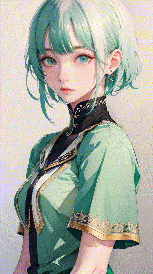 提示詞:blunt bangs, masterpiece, best quality, best illustration, ultra-detailed, upper body, solo, 1 girl, looking at viewer, upright, arms at sides, beautiful detailed eyes, concept art, white background, simple background, white hair, green gradient hair, short sleeves, watercolor pencil, expressionless, blush, virtual youtuber, short hair