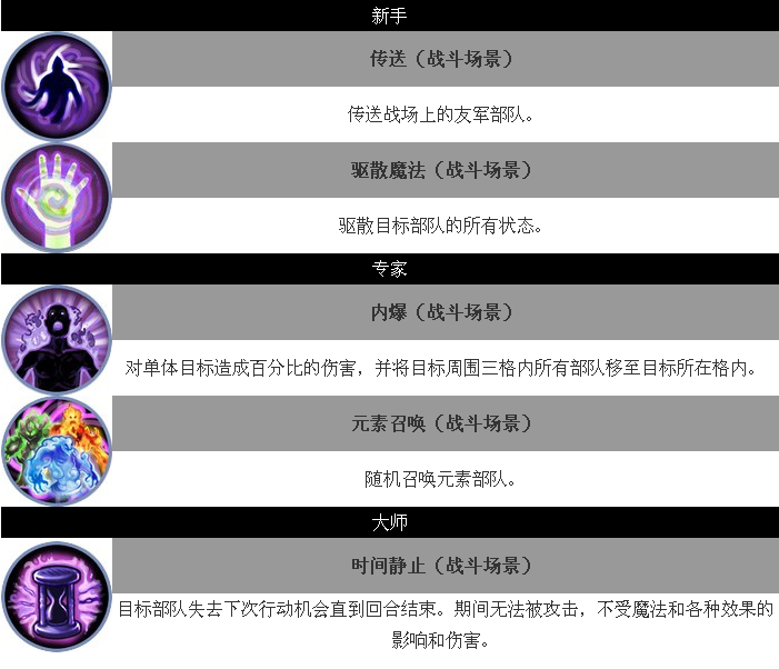 (再次提醒各位玩家:技能描述中出現的X并非代表一個單獨的數字,因多種情況有著不同的增益和算法(比如說X=英雄專業等級×魔法數值的魔法傷害)另外在游戲的開發過程中,將會不斷調整平衡性,魔法的名稱與圖標也可能會有變動。)