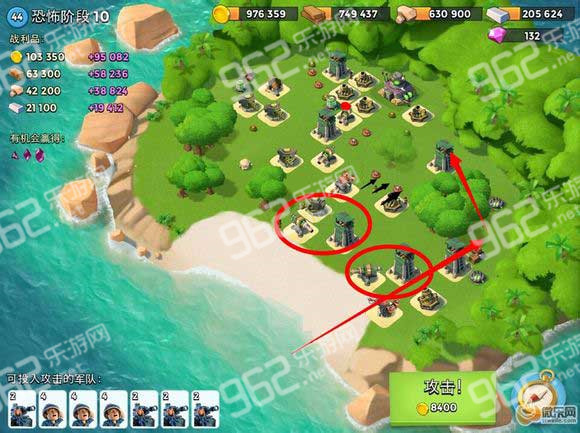 在登陸之前,以小加農為目標打掉岸邊的防御,然后從右邊慢慢網上推。上面紅點標錯位置了,應該是狙擊和小加農連接處,火炮打掉,安心拆基地!