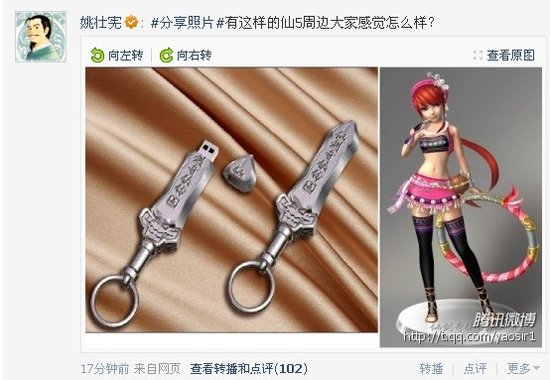 性急的姚仙于內部會議后在騰訊微博貼出了《仙劍五》的周邊照片,分別是劍型的U盤和小蠻美眉的手辦,隨后百游高級副總裁魏嘯(微博)確認了這一消息。