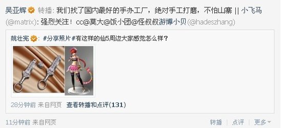 有玩家稱U盤造型很爺們,蘿莉手辦是宅男大愛,勢必會對游戲銷量產生積極作用,也有玩家擔心如此精致的周邊是否會提高游戲價格。百游營銷總監吳亞輝表示對產品質量非常有信心,不怕山寨。以下為姚仙,魏嘯,吳亞輝的微博截圖: