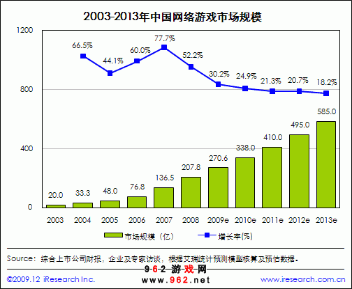 未來(lái)幾年網(wǎng)游行業(yè)仍將是中國(guó)網(wǎng)絡(luò)經(jīng)濟(jì)的核心產(chǎn)業(yè),預(yù)計(jì)在2013前,每年的增長(zhǎng)率將在20%左右,但再次出現(xiàn)爆炸式增長(zhǎng)的可能性不大,到2013年整個(gè)產(chǎn)業(yè)的收入將達(dá)到585億元。
