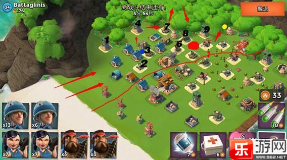 可以看到圖上是一個34級玩家,巨型加農炮與火箭發射器都有,不過沒關系,由于他將加農炮擺在中間我們可以,從邊路進攻繞過加農炮!