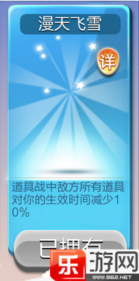 漫天飛雪效果:道具戰中敵方所有道具對你的生效時間減少10%。