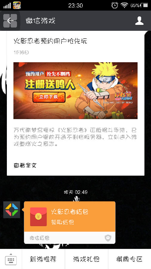 QQ的紅包在應(yīng)用寶禮包那里 微信的在游戲禮包旁邊有個(gè)鳴人頭像拉下來(lái)就是。