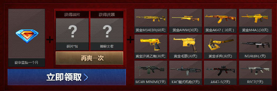 初次購買:支付15QB,立即獲得1個月豪華藍(lán)鉆+N個黃金碎片/白銀碎片+一個隨機(jī)道具+再爽一次!
